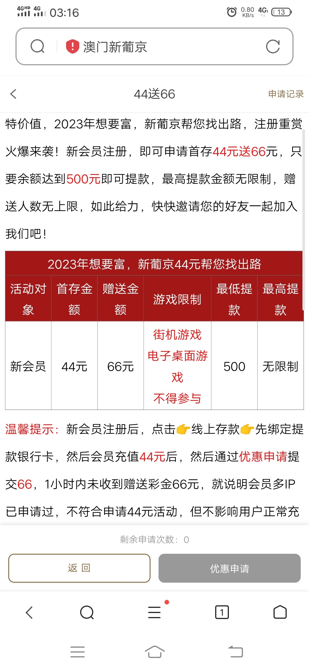 注册绑定个人信息然后充44再去活动中心申请,只能玩街机游戏最低提款500,具体情况看活动详情