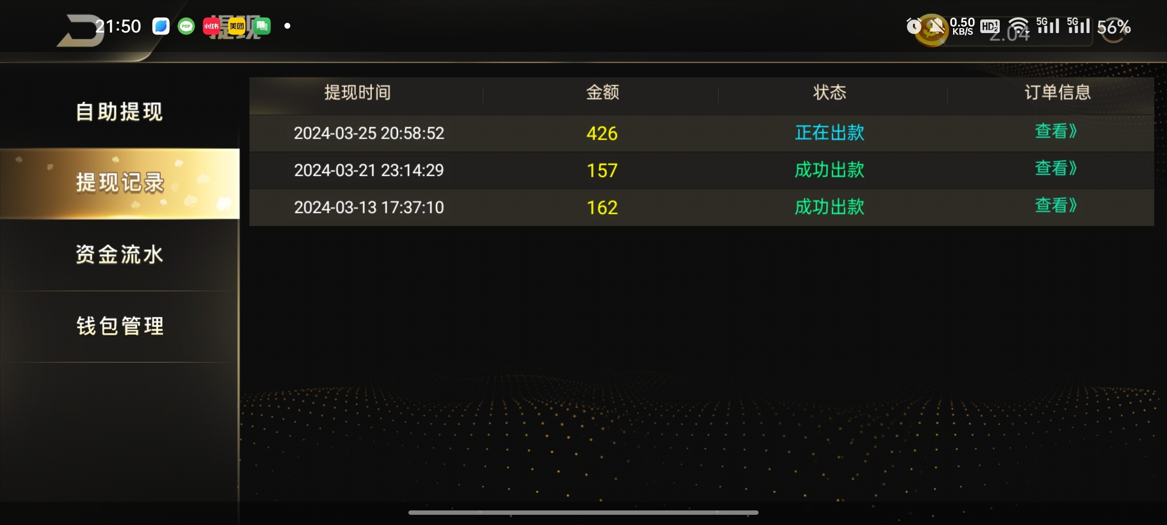 充了100提了426黑了,说什么注单审核,一般这种模板说注单审核就是黑了,大家避雷,别玩了,别充了,平台没有信誉,做不长久!