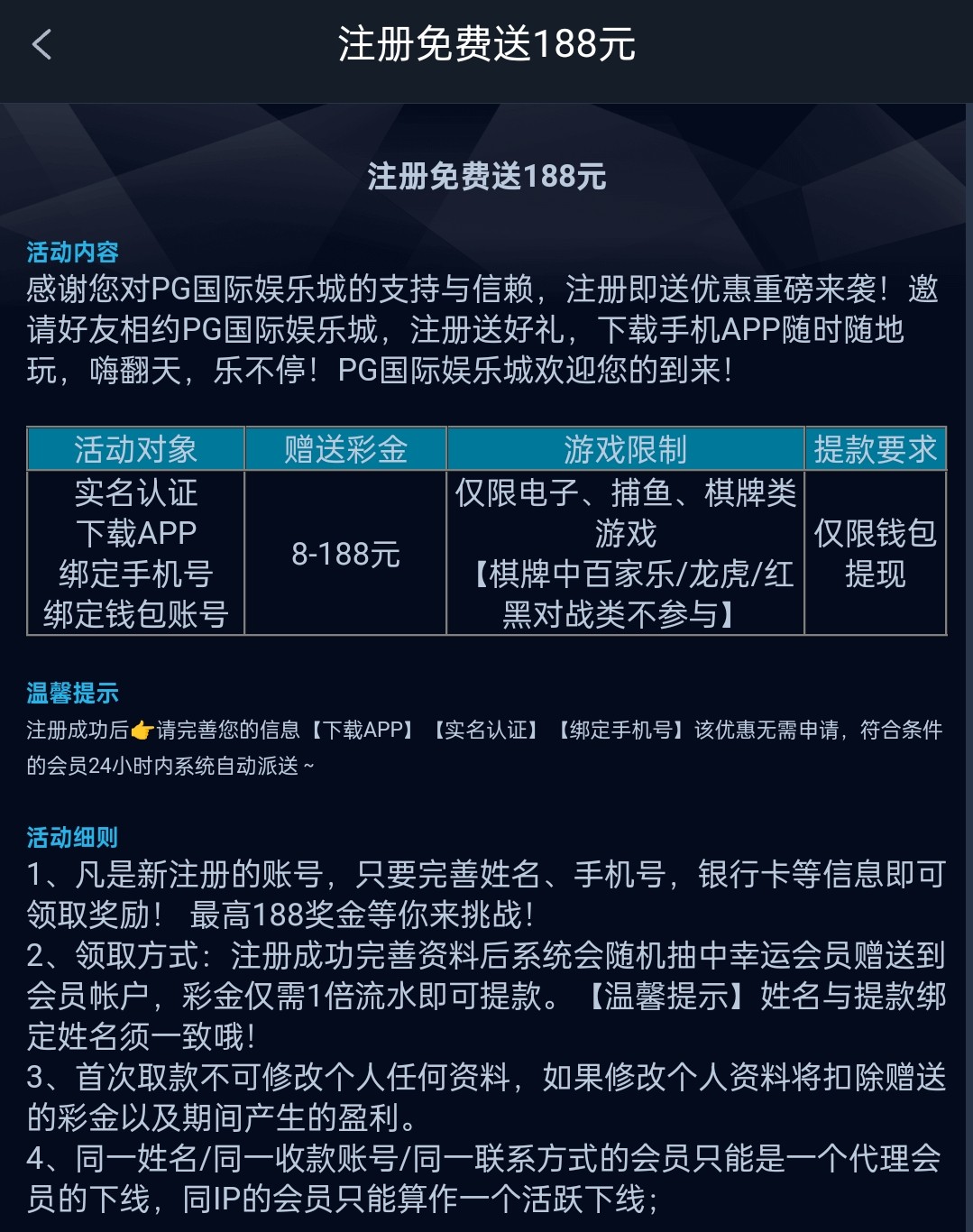 注册下载APP绑定手机号银行卡电子钱包24小时内到送,只能娱乐棋牌电子捕鱼,只能提现钱包,最低提款50